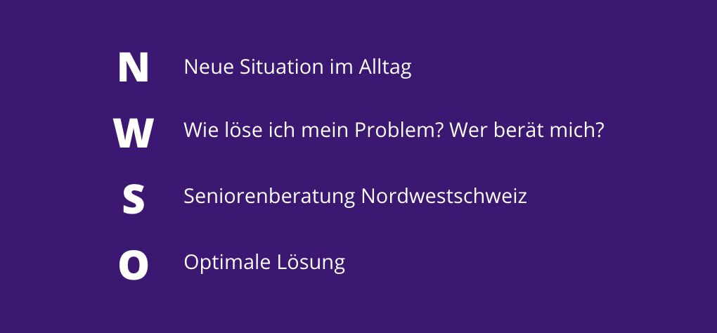 Älterwerden beinhaltet, sich neuen Begebenheiten zu stellen, sich damit auseinander zu setzen und sie zu meistern. Plötzlich auftretende kritische Lebensereignisse erfordern schnelle und kompetente Hilfestellung, welche abgestimmt ist auf die individuelle Lebenssituation. Das vielfältige Angebot für Senioren in allen Bereichen erschwert die richtige Wahl unter Zeitdruck. Seniorenberatung Nordwestschweiz begleitet Sie auf diesem Weg.
